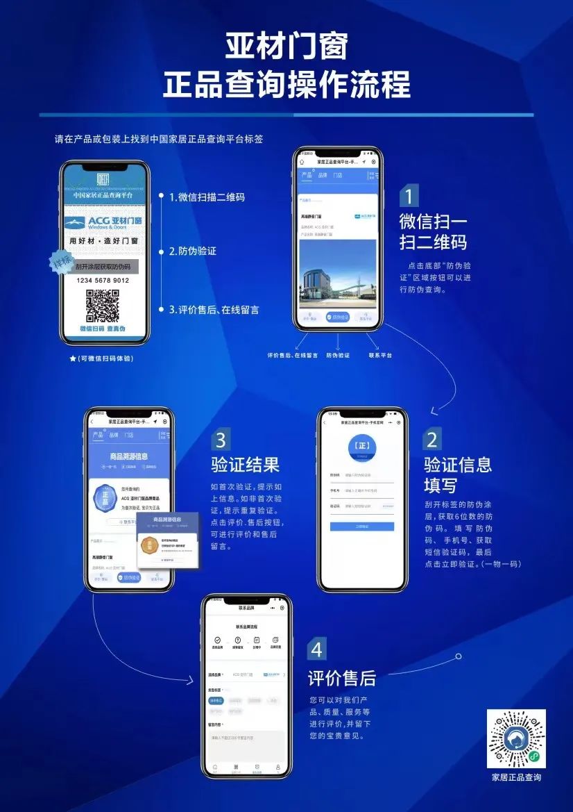 為進一步完善產品追溯體系,切實保護消費者權益,早在2022年,亞材門窗就已入駐中國家居正品查詢平臺。往后,消費者在收到亞材產品,打開微信掃一掃,識別防偽碼輸入查詢碼即可驗證品牌以及評價產品及服務。